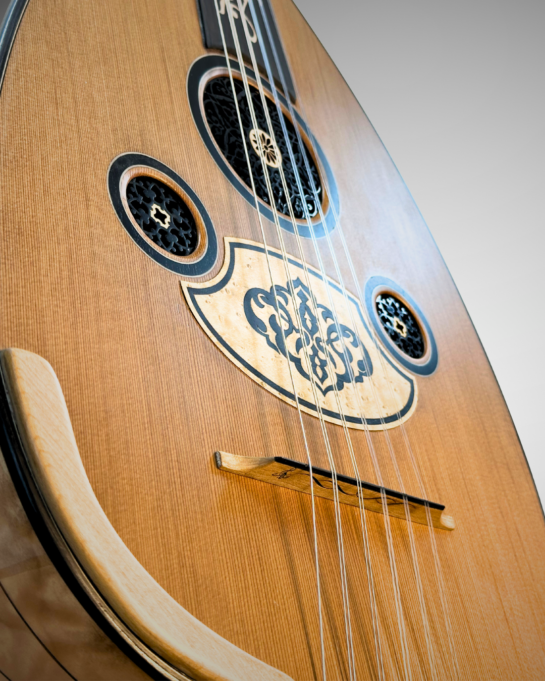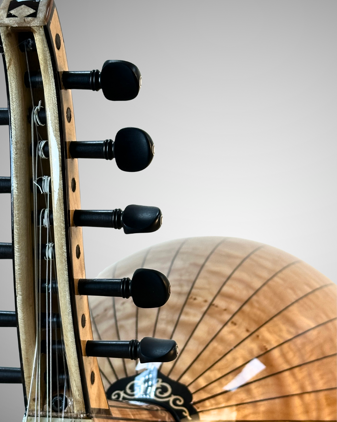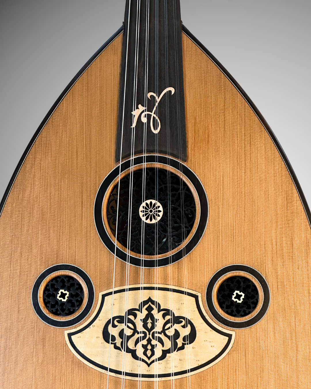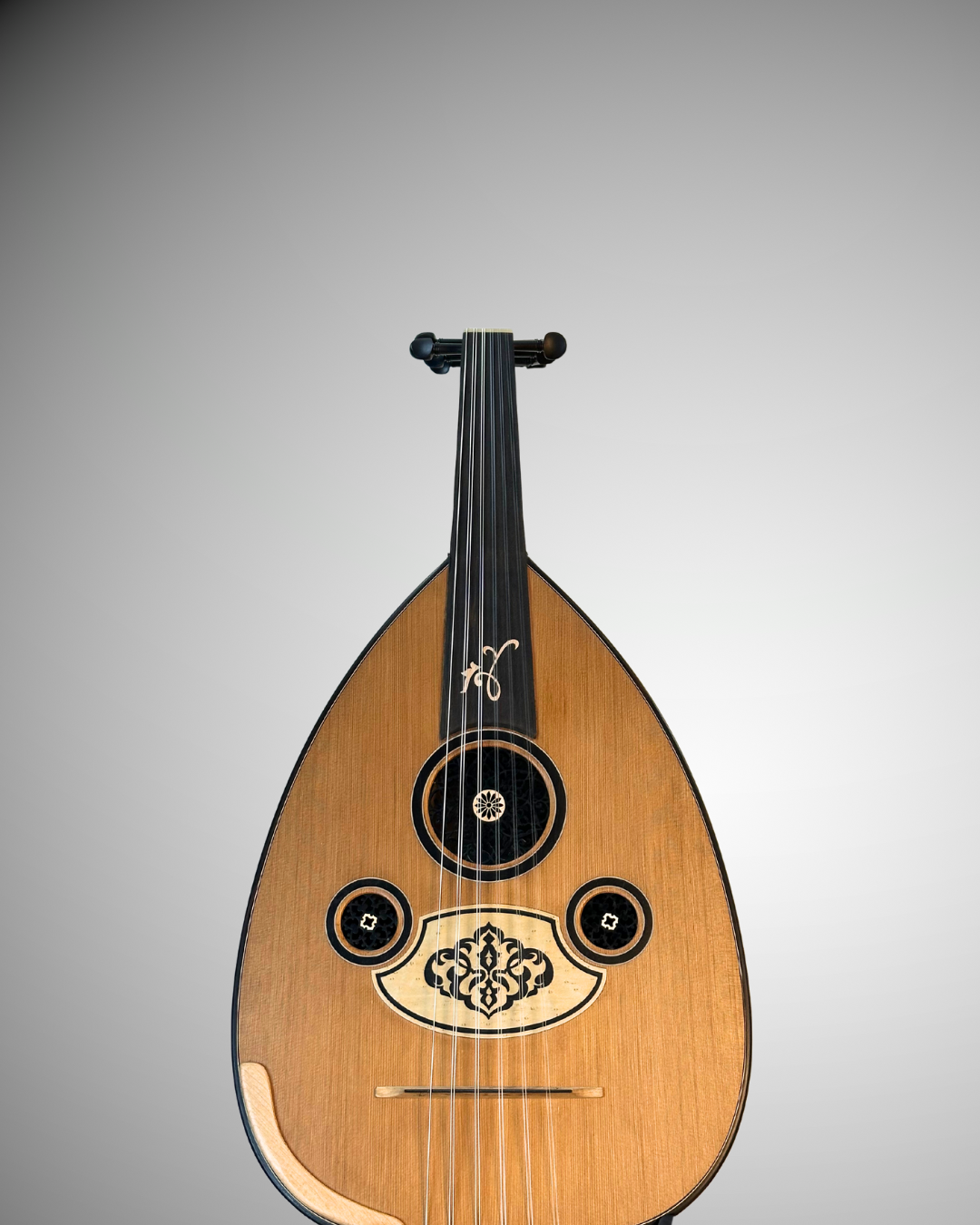 A premium oriental oud crafted as a custom-made instrument, designed for rich, warm, and well-balanced sound, using carefully selected premium woods: